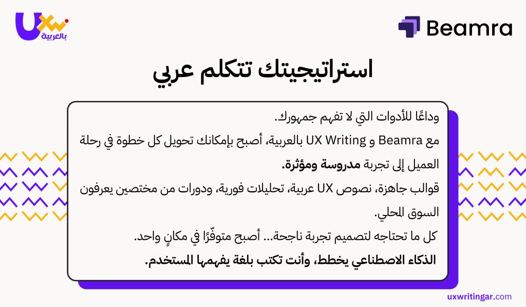 - لأنها تجمع بين أداة تنفيذية (Beamra) وخبرة عربية متخصّصة (UX Writing بالعربية)، ما يعني أن الاستراتيجيات المصمّمة ستحصل على نصوص واجهات ومحتوى مهيأ ثقافياً ولغوياً.